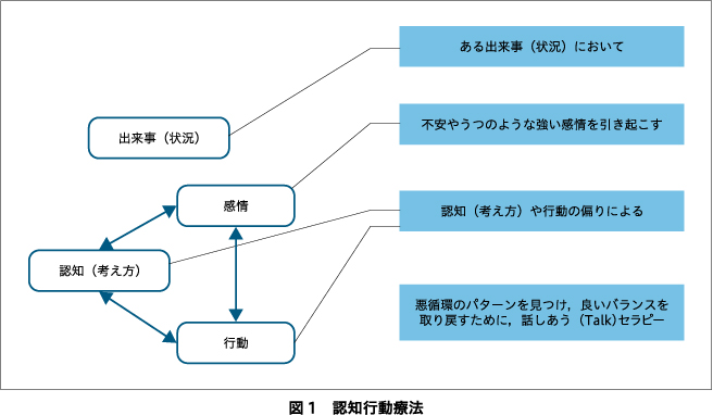 認知行動療法は,ストレスフルな出来事(状況)に対して,不安やうつのような強い感情を引き起こす認知や,行動の偏りによる悪循環のパターンを見つけ,良いバランスを取り戻すために話しあうセラピーである(図1).精神科領域における認知行動療法は,うつ病,不安症では16回程度を実施し,その効果は薬物療法と同等以上であることが知られている.また,不眠症は,悪化するとうつ病や不安症といった精神疾患につながりうる.不眠症の認知行動療法は,6回程度を実施する.千葉大学は,2009年度から英国の取り組みをモデルにした認知行動療法の専門職人材養成を進めてきた.