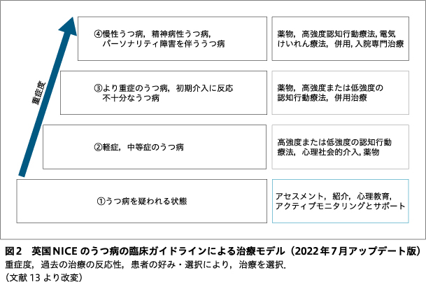 2009年に公表された,英国のNational Institute for Health and Care Excellence(NICE)のうつ病の臨床ガイドラインでは,stepped-care model(段階的モデル)により,重症度別に4つの段階に分け,診療の効率化を進めた.図2に示すように,その後,2022年にアップデートされ,matched care modelという呼称に変更されるとともに,重症度,過去の治療の反応性,患者の好み・選択により,患者にマッチしたケアを選択するように小変更が加えられた13).