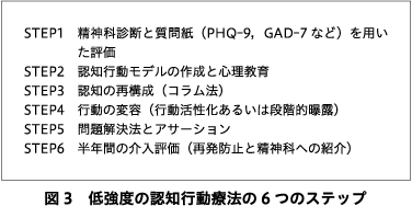 以上のような低強度の認知行動療法を6つのステップに分けると図3のようになる.