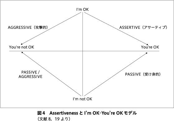 アサーション・トレーニングは,アサーティブなコミュニケーションのトレーニングとも呼ばれ,Wolpe, J. とLazarus, A. A. によって開発された積極的な自己主張をできるようにするための方法である19).いくつかの方法があるが,ここでは,著者の好むHarris, T. A. のI’m OK-You’re OKモデル8)を加えた図4で説明する.アサーティブなコミュニケーションとは,「あなたもOK.私もOK.」というように,相手も自分も肯定する,Win-Winな関係をめざすコミュニケーションのことである.「あなたはOKでない.私はOK.」という攻撃的なコミュニケーションは,ハラスメントの加害者に,「あなたはOK.私はOKでない.」という受身的なコミュニケーションは,ハラスメントの被害者になりがちなので,それらをやめて,アサーティブなコミュニケーションを実践できるように,実際に声に出す会話練習,ロールプレイングのトレーニングを習慣化してもらう.アサーティブなコミュニケーションで,自分と相手の意見の違いをそれぞれ,そのままで良いと受容し,尊重し合って,どちらも正しいとしてとらえ,両者の間にある問題に後で折り合いをつけていく.自分と相手の間に残る問題は,次に述べる問題解決法で,メリット・デメリット分析をして,解決案を決めるのである.