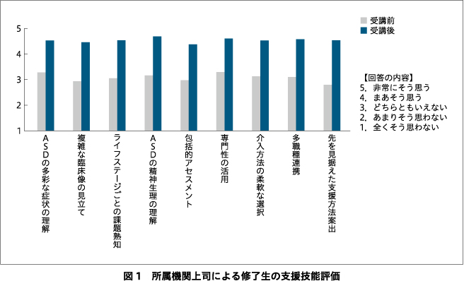 また,修了生における教育効果のみならず,修了生を通じた所属機関での波及効果も認められている.修了生の支援技能評価と同時に,所属機関における「発達症に関する知識の深化」「適切な理解の向上」「対応力の向上」についても,所属機関上司へ評価を依頼し,5段階中4前後の評価(3以上が高評価)を得ている.