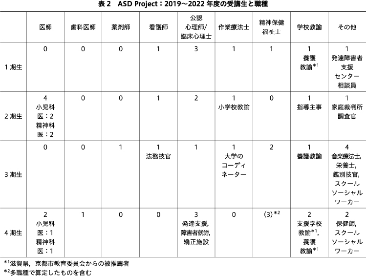 ASD projectでは,就労・雇用の分野との連携や人材の育成も視野に入れ,障害者雇用を行う特例子会社とその親会社で活動する人材など,就労・雇用分野の受講生も受け入れている.また,長年就労支援に携わってきた/現在就労支援機関に所属する専門職を教育プログラム講師として迎え入れ,就労分野での支援や就労関連機関との連携において重要となるポイント,発達症の強みを活かすための視点について学習する機会を強化している.これにより,メンタルヘルス問題の陰で見逃されている発達症の特性に注目し,必要に応じた多機関連携や強みを活かす取り組みを行う就労支援分野の人材育成が可能となっている.